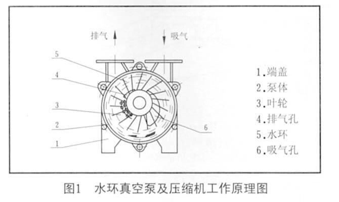 ??如圖1所示,葉輪3偏心地安裝在泵體2內(nèi),因此當葉輪3旋轉(zhuǎn)時,水受離心力的作用而在泵體內(nèi)壁形成一旋轉(zhuǎn)水環(huán)5,水環(huán)上部內(nèi)表而與輪轂相切沿箭頭方向旋轉(zhuǎn),在前半轉(zhuǎn)過程中,水環(huán)內(nèi)表面逐漸與輪轂脫離,因此在葉輪葉片間與水環(huán)形成封閉空問,隨著葉輪的旋轉(zhuǎn),該空間逐漸擴大,空間氣體壓力降低.氣體被吸入空間:在后半轉(zhuǎn)過程中, 水環(huán)內(nèi)表面漸漸與輪轂禹靠近,葉片間的空間逐漸縮小,空間氣體壓力升高,高于排氣口壓力時,葉片間的氣體被排出, 如此葉輪每轉(zhuǎn)動一周,葉片間的空間吸排一次,許多空間不停地工作,泵就連續(xù)不斷地抽吸或壓送氣體。